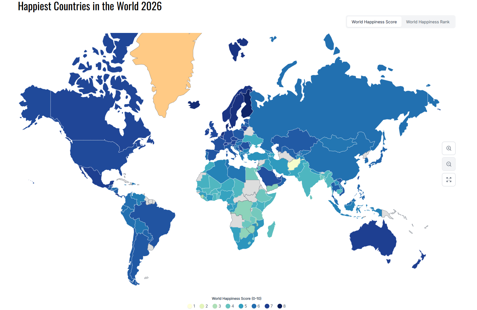 Although the data is presented with an interactive map, it can be improved to see countries that are improving on their happiness score over the years. The World Happiness Report utilizes the respective country’s “gross domestic product per capita, social support, healthy life expectancy, freedom to make your own life choices, generosity of the general population, and perceptions of internal and external corruption levels” to compute scores which determine the happiness ranking. The score for one year is used by averaging the score from the previous 3 years. An example would be the 2025 happiness score would be the average from 2022-2024.