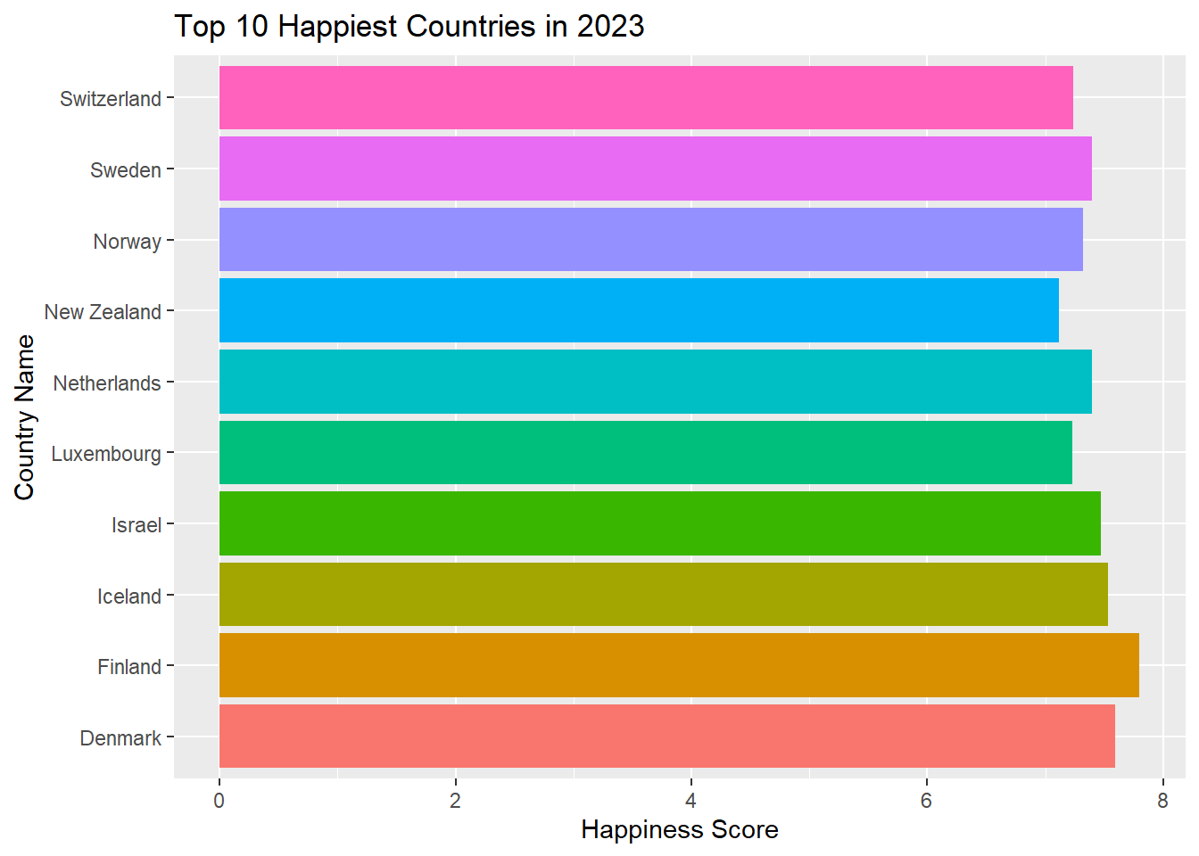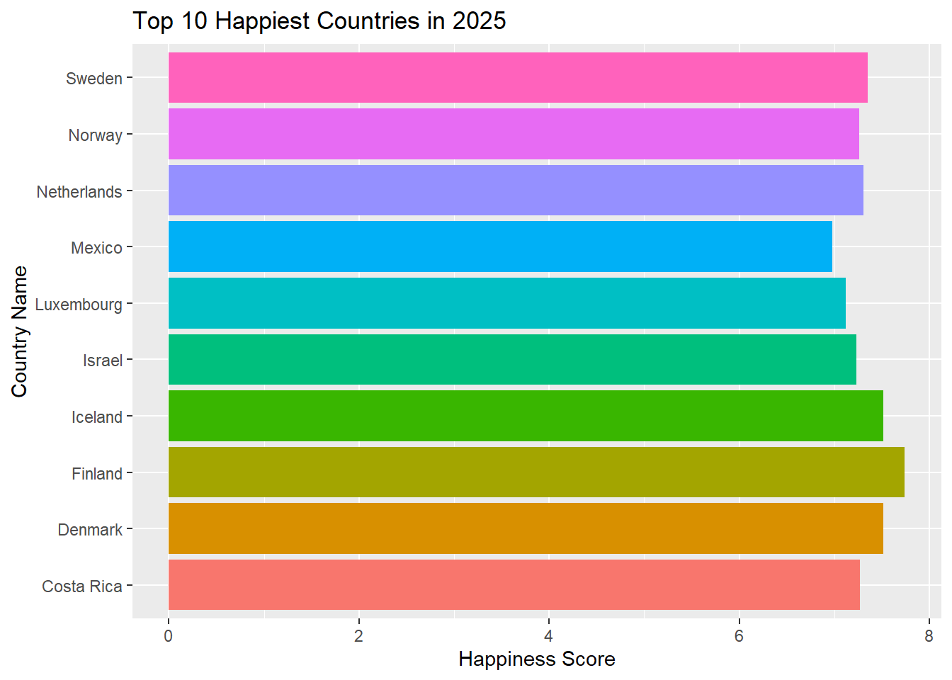 As we can see in the two graphs above, the same countries have been ranked in the top 10 based on their happiness score. One thing to note is that the countries have been increasing their own happiness score through out the years. This can be for several reasons, including increase in GDP or life expectancy. However, as seen with other countries outside of the top 10, it is important to take into consideration the impact of developing health and technological sciences as well. An example of this would be Mexico. Mexico’s happiness rank in 2023 was 36th, and as of 2025 is now ranked 10th in the world. If we wanted to see the bottom 10 or least happiest countries we would easily be able to within the code.