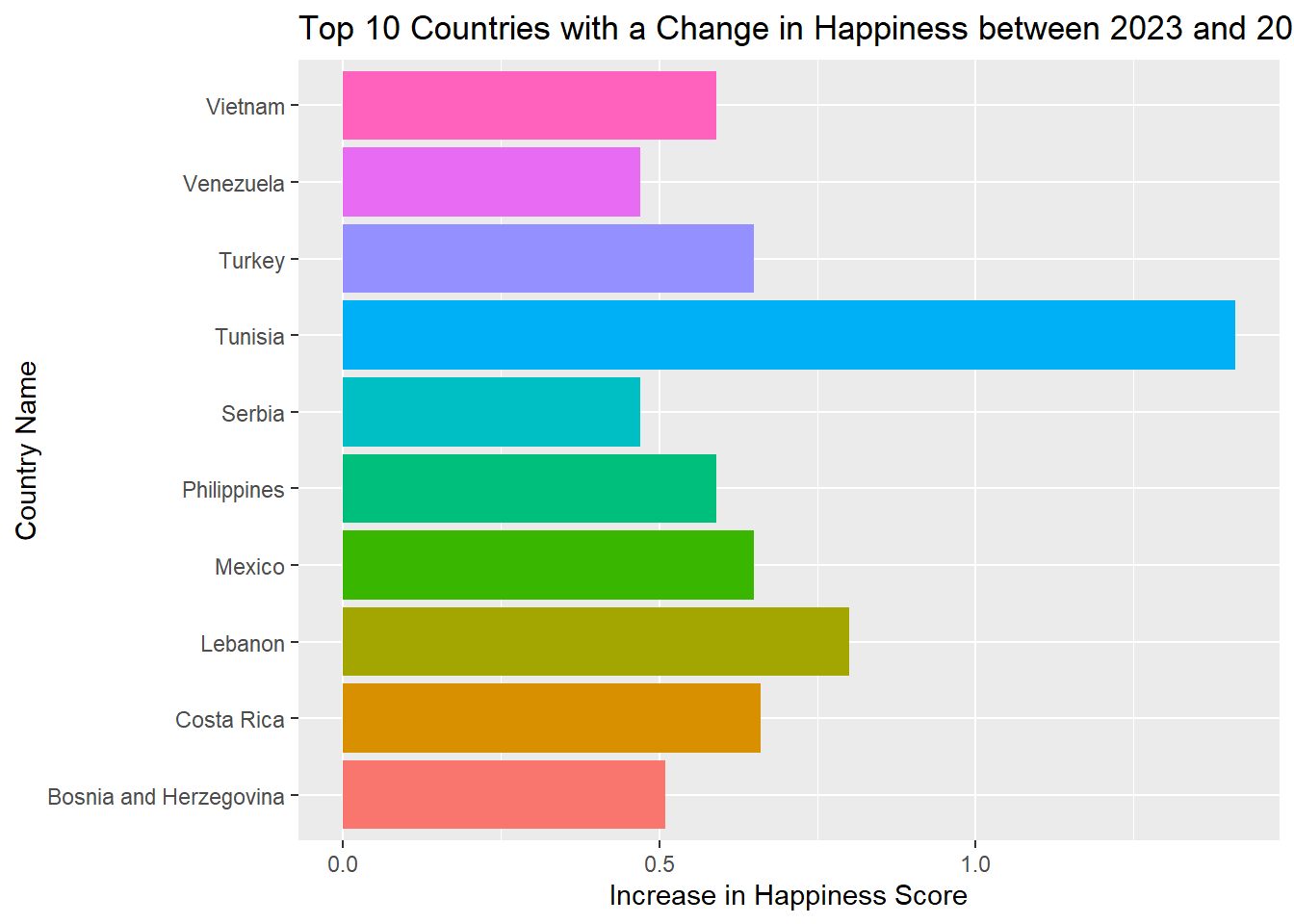 What I wanted to see with this data was what countries have been working on increasing their overall happiness, even if they were not highly ranked. In the graph above we can see countries, like Tunisia, ranked 110th in 2023 and 70th in 2025, increase their overall happiness by over one point. Although it is easy to see which countries are doing well and ranked very happy, I believe it is important to note countries that are also improving their standards of living as well. If we wanted to see the countries with the least increase or the most decrease, we would easily be able to see that with a change in the code as well.