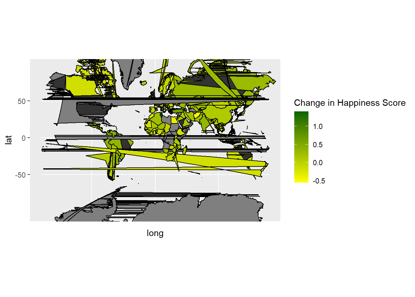 Although the above map has been distorted due to my code, I wanted to show a heat map of countries that have increase their level of happiness over the years. The darker green a country is, the larger increase in levels of happiness. I think it important to note that developing countries have a larger increase in their score, which could be due to growth in population or the increase in GDP.